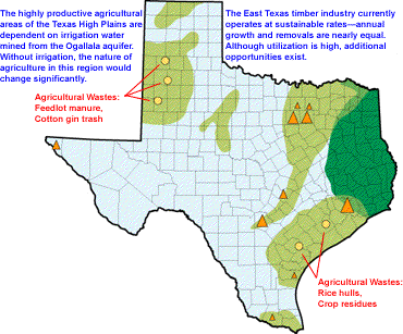 As one of the nation's leading agricultural states and with a large forest industry, Texas is a major biomass producer (see Figure 8). Additionally, the state's very large urban base contributes substantial amounts of biomass-derived wastes. Figure 9 identifies Texas' major production areas and the types of biomass that each generates.