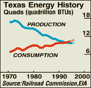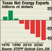 During World War II, Texas exported vast amounts of oil that helped fuel the Allied advance on Germany. Texas now uses more energy than it produces(8). In 1994, the state had net energy imports consisting of $1 billion worth of coal(9) and $6 billion worth of oil(10). Much of the growth in energy demand stems from the state's increasing population and surging economy. In just 40 years, Texas could be importing more than 80 percent of the energy required to meet its needs(11). Imports will make the state--and the U.S. as a whole-- highly vulnerable to price fluctuations and political upheaval in the Middle East and other oil producing regions.(12)