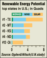 Before others recognized the value of oil, Jett Rink, the wildcatter in the 1956 movie "Giant" was making a fortune in the energy business. Today, Texas has the opportunity to become a leader in the global market for renewables. The Lone Star State has more renewable energy potential than any other state.(31) Wind power alone could generate up to 136,000 megawatts of electricity, more than twice the state's total generating capacity.(32) Much of the state's wind and solar power potential lies in the rural regions of west and south Texas, where jobs and economic development are sorely needed. By shifting to renewable energy, Texas can recapture some of the money now being used to import energy from other states and countries. A move toward renewables would also spur the economy, create jobs and increase our tax base.